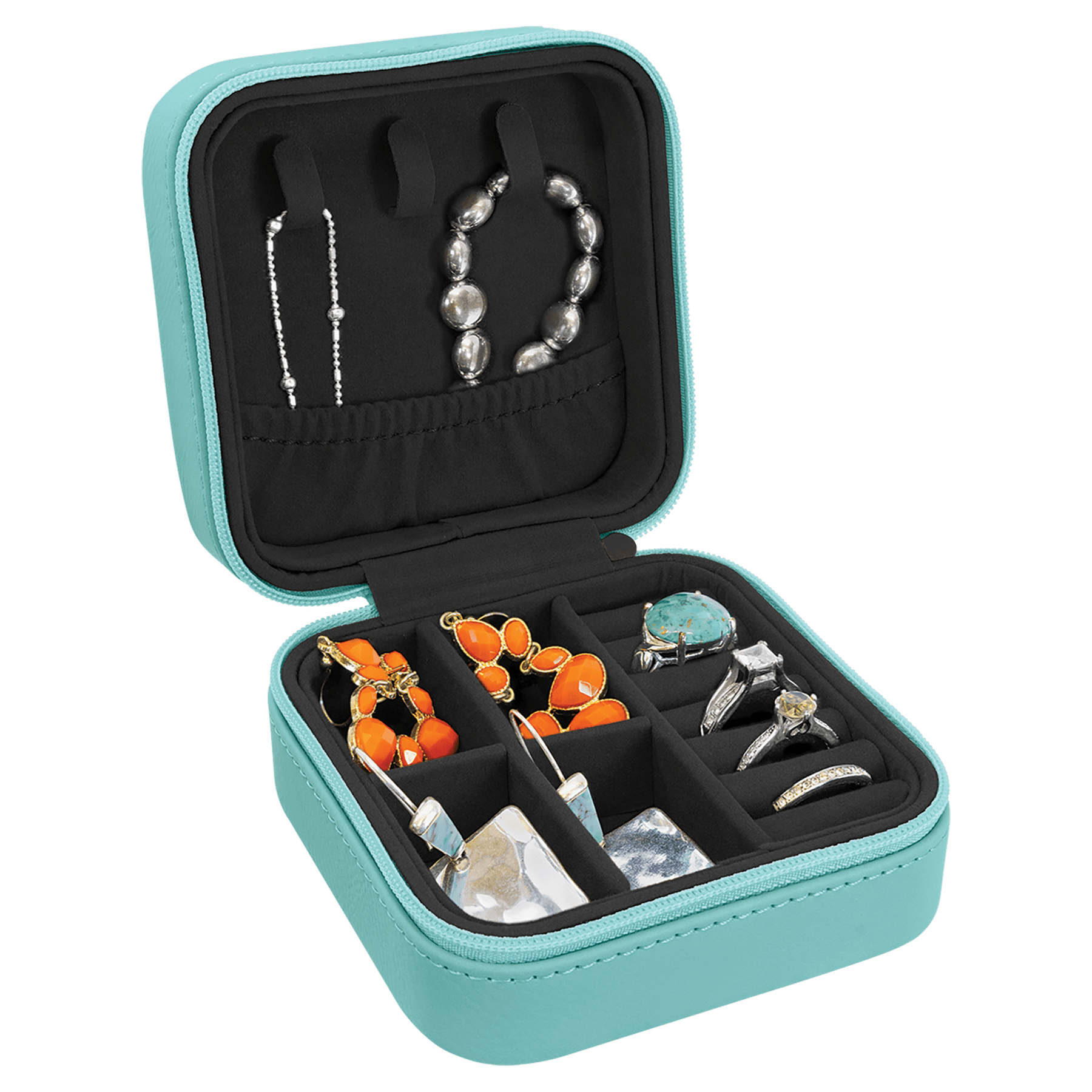 Keep your treasured pieces safe and organized wherever your adventures take you. This personalized travel jewelry box combines compact convenience with elegant storage, featuring dedicated compartments for rings, necklaces, bracelets, and earrings. Customize it with your name or initials for a touch of personal style that makes the perfect gift for jet-setters and jewelry lovers alike. Durable construction protects your valuables during trips, while the sleek design fits easily into carry-ons and luggage. Travel in style without compromising on organization or security.